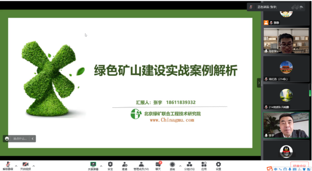 张宇高级工程师为大家详细介绍了绿色矿山建设的内涵、绿色矿山评价范围、评价方法及评价指标要点,并结合一系列具体案例深入解析了在实际工作中如何开展绿色矿山评价,最后张宇高级工程师还结合绿色矿山发展现状及发展趋势与参会师生就绿色矿山评价的相关问题进行了交流与探讨。