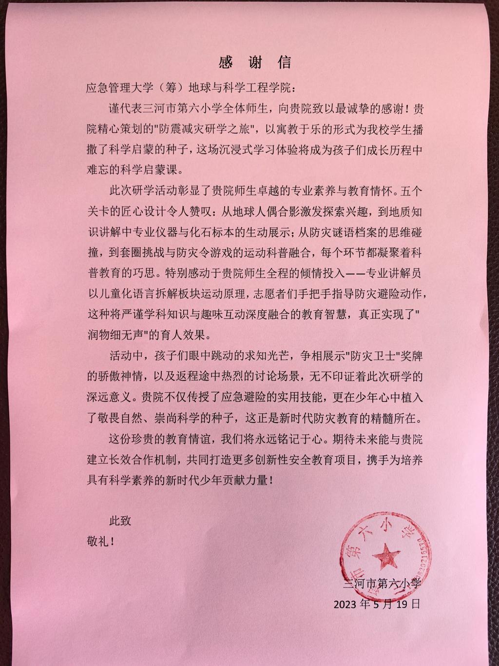 近日,sunbet申搏官方网站收到来自三河市第六小学全体师生的感谢信,信中高度评价了学院5月15日策划的“防震减灾研学之旅”活动,并对sunbet申搏官网师生在活动中表现出的专业素养与教育情怀表达了诚挚谢意。