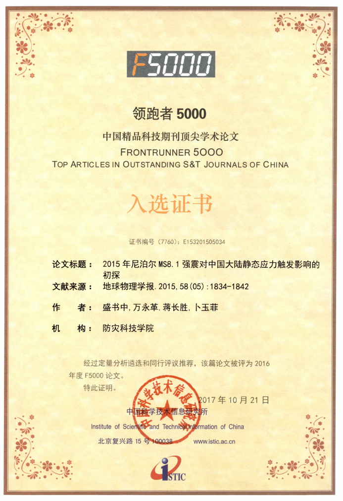 2017年中国科学技术信息研究所公布的2016年度“领跑者5000——中国精品科技期刊顶尖学术论文(F5000)”,我系盛书中副教授为第一作者撰写发表的“2015年尼泊尔MS8.1强震对中国大陆静态应力触发影响的初探”论文入选,该论文发表在《地球物理学报》(2015年第58期)上,论文的资助项目为中国地震局教师基金项目(20140102) 、中央高校基本科研业务专项资金(创新项目团队资助计划) (ZY20110101) 和国家国际科技合作专项项目(2012DFG20510)。该论文为sunbet申搏官网第一篇入选F5000(即领跑者5000)的学术论文,入选F5000的论文需经过定量分析遴选和同行评议推荐。该文能够入选,说明其内容科学、严谨,反映该研究具有一定的创新性和较高的学术水平。