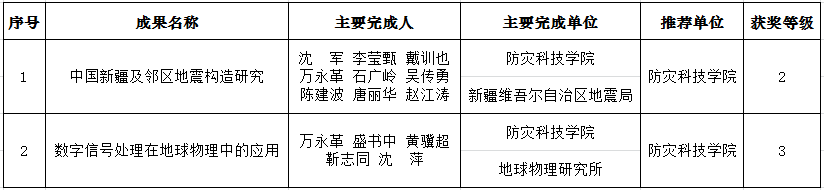 近日,中国地震局2017年度防震减灾科技成果奖评选结果揭晓,由sunbet申搏官方网站推荐,沈军教授等完成的“中国新疆及邻区地震构造研究”和万永革教授等完成的“数字信号处理在地球物理中的应用”项目分别获得中国地震局2017年度防震减灾科技成果奖二等奖和三等奖。