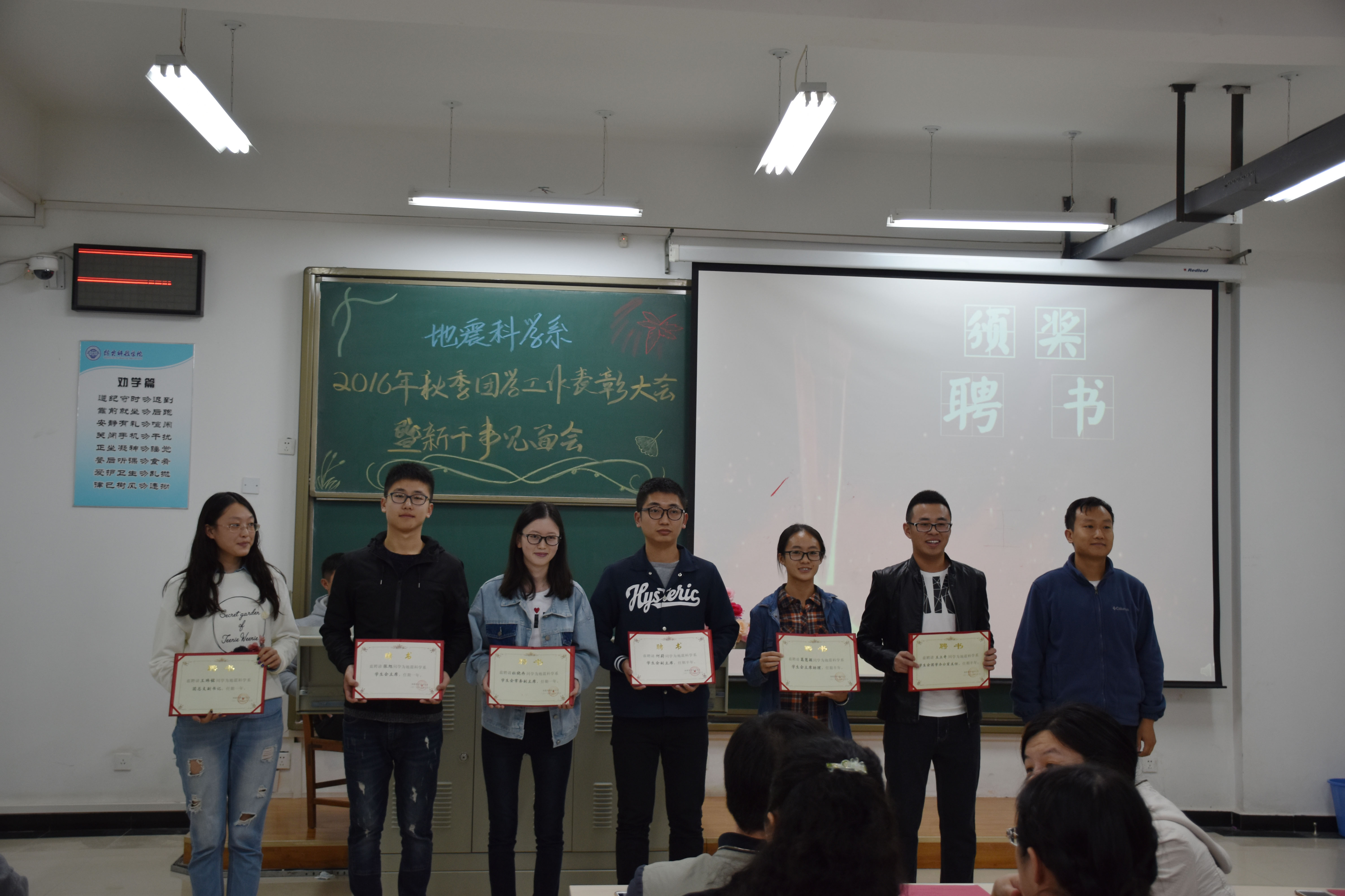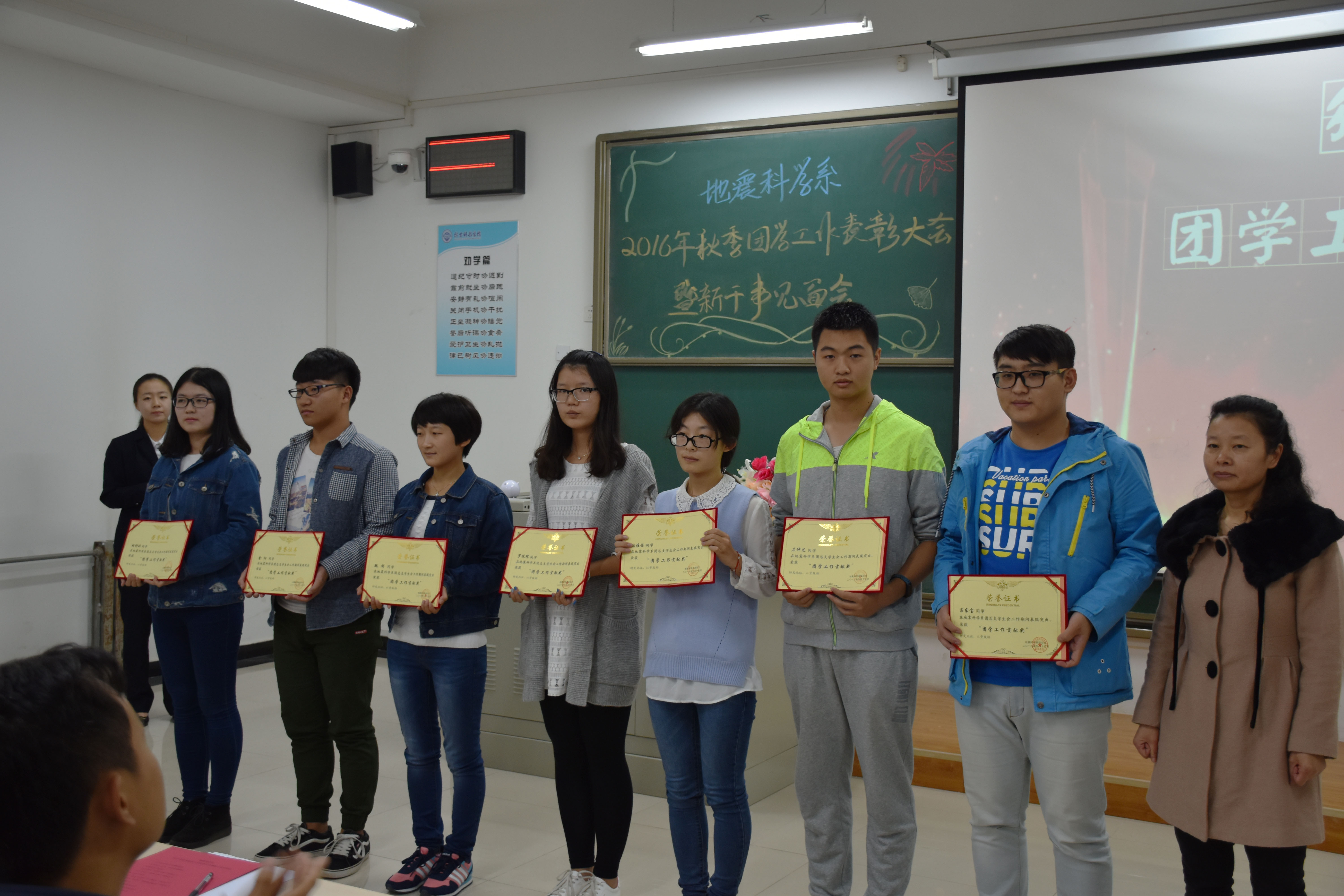 10月13日下午,我系在北校实验楼306教室举行2016年秋季团学工作表彰大会暨新干事见面会。参加此次大会的有系团总支书记唐圣华老师,辅导员牛永君、秦海啸、张玉琛、王鹤、牛晓龙老师,系团总支学生会全体成员、各班学生代表参加了大会。