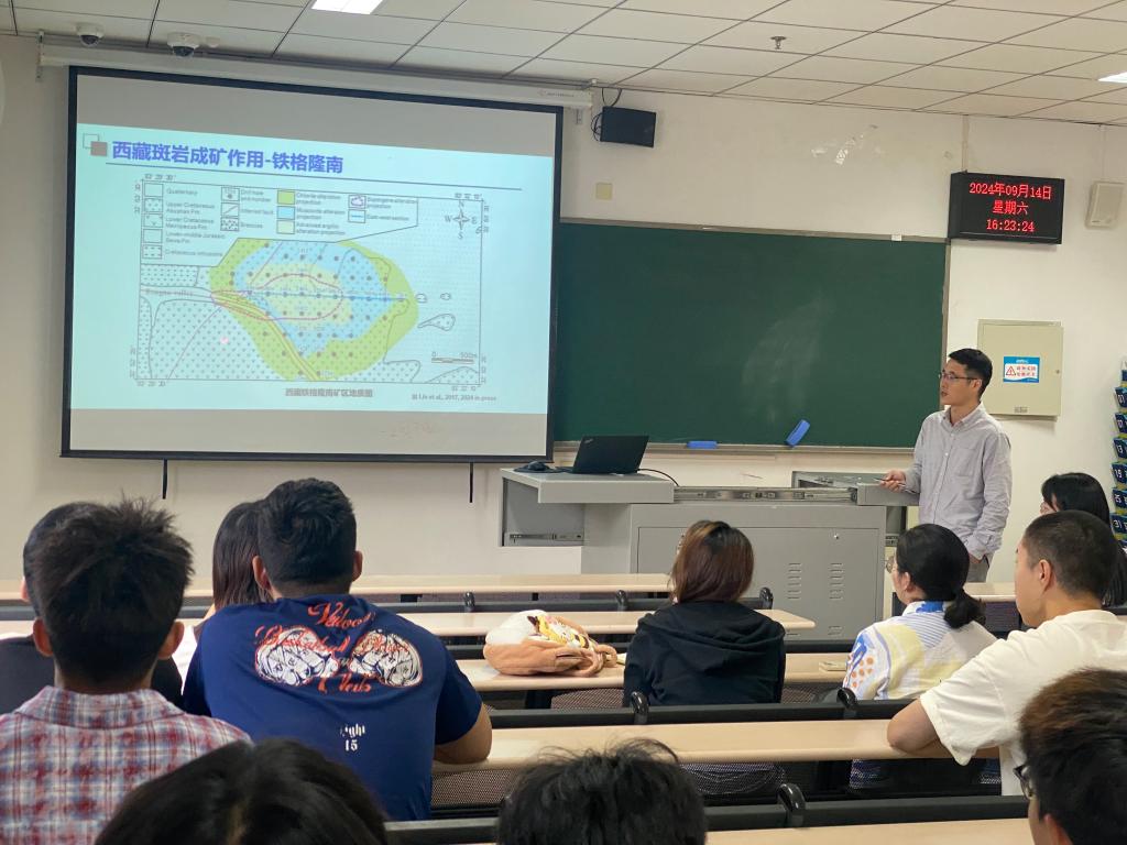 林彬研究员基于野外详实的地质调查、钻孔编录等工作,精细解剖不同构造背景下斑岩成矿系统结构,系统介绍了如何构建甲玛“斑岩成矿系统多中心复合成矿模型”以及铁格隆南“斑岩-浅成低温热液叠加成矿模型”,进而指导深部及外围取得重大找矿突破,并就同学们感兴趣的问题介绍了在世界多地访学和野外调查的情况。报告结束后,李真真副教授和学生们向林彬研究员踊跃提问,林彬研究员与现场师生进行了互动交流,从研究初衷、科研心得和个人发展等方面进行了答疑,开阔了学生视野,厚植了通过国家战略矿产资源报效祖国的理想信念。