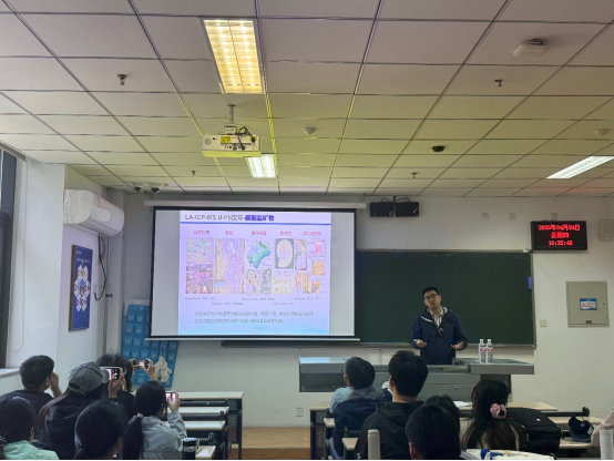 张亮亮从地球化学领域中应用的原位微区分析技术与原理、LA-ICP-MS原位微区分析技术的原理及应用范围、矿物U-Pb定年体系及地球科学应用、LA-ICP-MS技术前沿等几个方面,详细介绍了LA-ICP-MS分析技术及中国地质大学(北京)科学研究院矿物激光微区分析实验室(Milma Lab)创新性研究成果,为在场师生带来了一场学术盛宴。同时,作为中国地质大学(北京)科学研究院招生宣传的重要一站,张亮亮为学校师生介绍了中国地质大学(北京)科学研究院的卓越导师团队、实验技术分析平台和研究生培养机制等,并鼓励大家积极报考科学研究院。