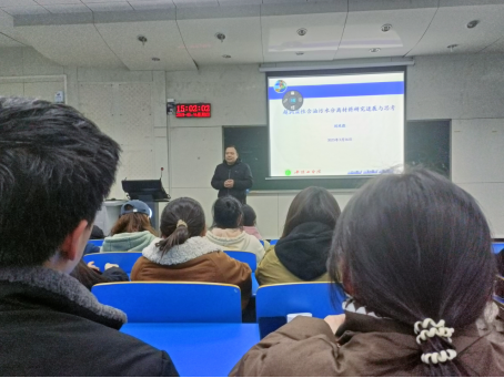 周老师结合自己的教学和研究方向,以“超润湿性含油污水分离材料研究进展与思考”为主题,通过水滴在荷叶表面滚动、水黾在水面滑行、超疏水疏油防污染衬衫等实例,讲述了自然界出现超润湿现象的原因,并结合微纳米结构和表面化学组成,为大家介绍了超润湿材料的自清洁和净水作用。尤其详细介绍了对油水润湿性相反的超润湿多孔材料,能够高效地处理油气、化工和餐饮等行业的含油(有机试剂)废水,在减少污染的同时,回收可能的油水资源,助力污水处理行业实现碳中和目标。最后,周老师与同学们进行了交流。