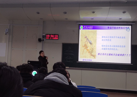 围绕报告主题,孙颢瑄博士从生活中的常见现象出发到仿生工具及材料的研究创造进行举例分析(如:鲁班发明锯子、蝙蝠回声定位到雷达、仿鲨鱼皮结构游泳衣和蝴蝶翅膀的结构色应用等),吸引了同学们的科研兴趣,扩宽了同学们的知识视野。结合自己的科研经历,详细讲解了自然界荷叶超疏水结构在科研中的应用及实现超疏水性能的方法和途径,并由沙哈拉银蚁展开扩展到了当前被动降温复合材料的研究,最终将当前的研究和国家节能减排发展战略相结合提升了同学们的科研认知。鼓励同学们善于发现生活中的真善美,培养自己的求知欲和创新意识,为社会的进一步发展增光添彩。