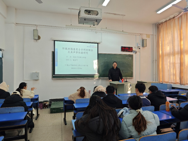 2024年11月28日下午16时,买球的app排行榜前十名推荐施雪军博士在4号教学楼4203教室举办了学术讲座,报告题目为《环氧树脂基复合材料的制备及其声学性能研究》,买球官网22级材料科学与工程专业的学生聆听了本次报告。