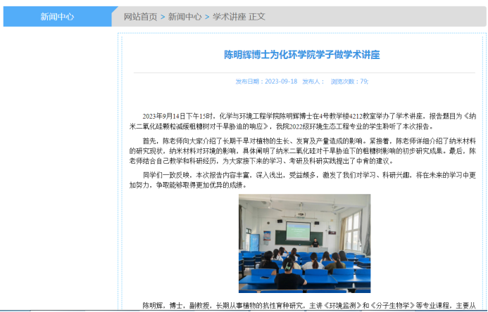 2024年12月19日下午15:00-16:30时,买球的app排行榜前十名推荐陈明辉博士在4号教学楼4314教室举办了学术讲座,报告题目为《纳米氧化铜减缓粗糠树对低温胁迫的响应研究》,买球官网2024级环境生态工程专业的学生们聆听了本次报告。